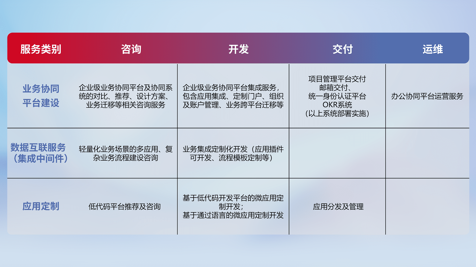 针对钉钉、、、企微、、IDaas等平台级产品提供产品的规划、、、、方案、、、、交付、、定制化开发等服务,,,,实现如统一协同办公、、智能客户服务、、、、混合会议管理、、、智能数据查询、、等业务场景,,,,实现数字化转型。。。。