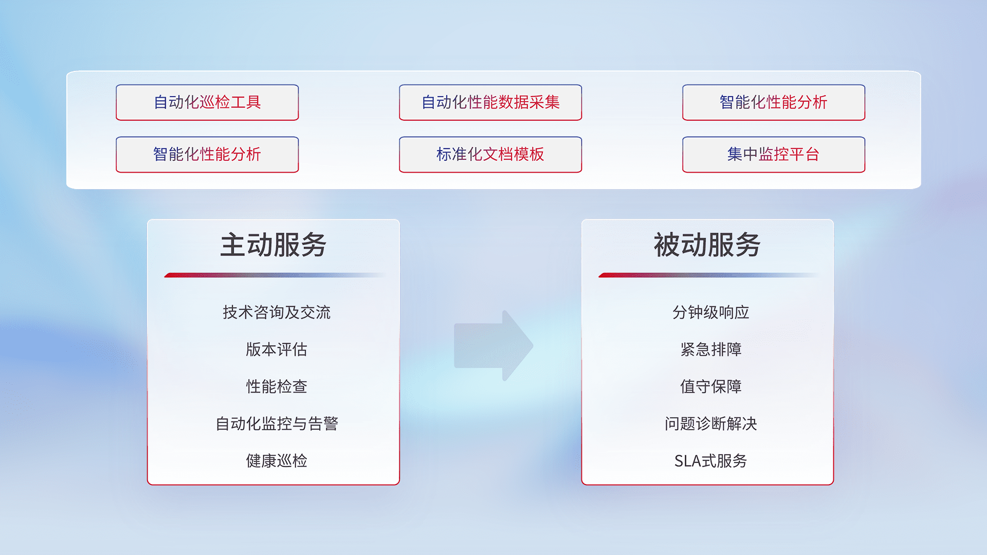 智能化工具和标准化文档,,,保障服务质量,,,提供主动服务(包含技术咨询、、、、版本评估、、、性能检查、、自动化监控与告警、、、、健康巡检)和被动服务包含(分钟级响应、、、、紧急排障、、、值守保障、、问题诊断解决、、、SLA服务)。。。。
